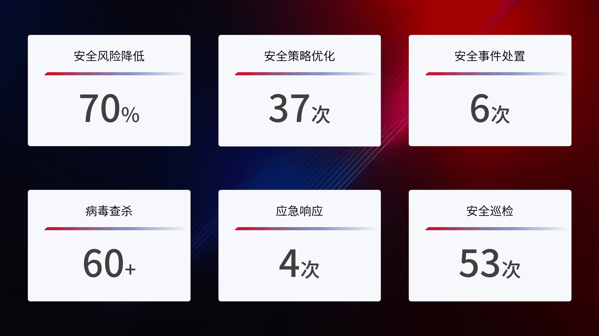 提供全面的安全事件报告体系,,,,包括处置报告、、、、周报、、、季度和年度总结,,,结合持续监控,,帮助客户深入了解网络安全状况。。