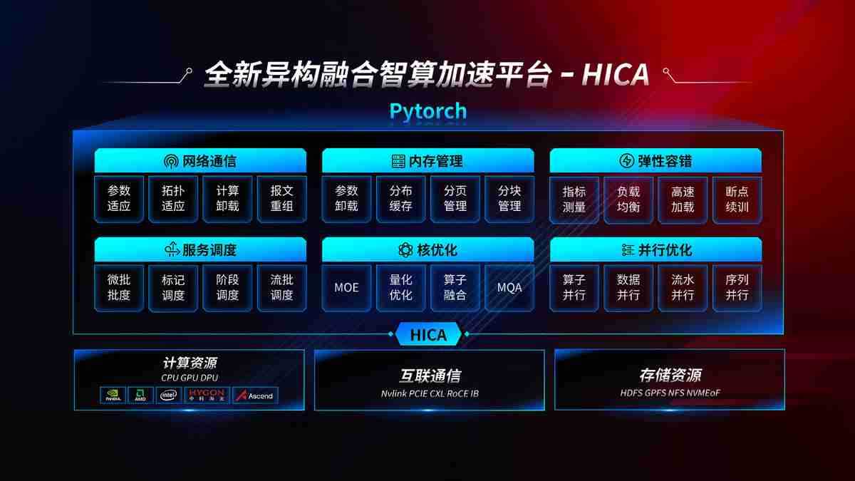 通过自研的服务层、、中间适配层、、以及调度编排算法,,,,采用数据并行、、模型并行等多种并行方式,,把并行计算任务进行有效的分解,,使其分别由相应的软件栈和算力资源来承接。。当GPU资源变化,,HICA可以实时动态调度计算子任务并调整模型拓扑和架构,,,,以充分聚合各种算力资源。。。。